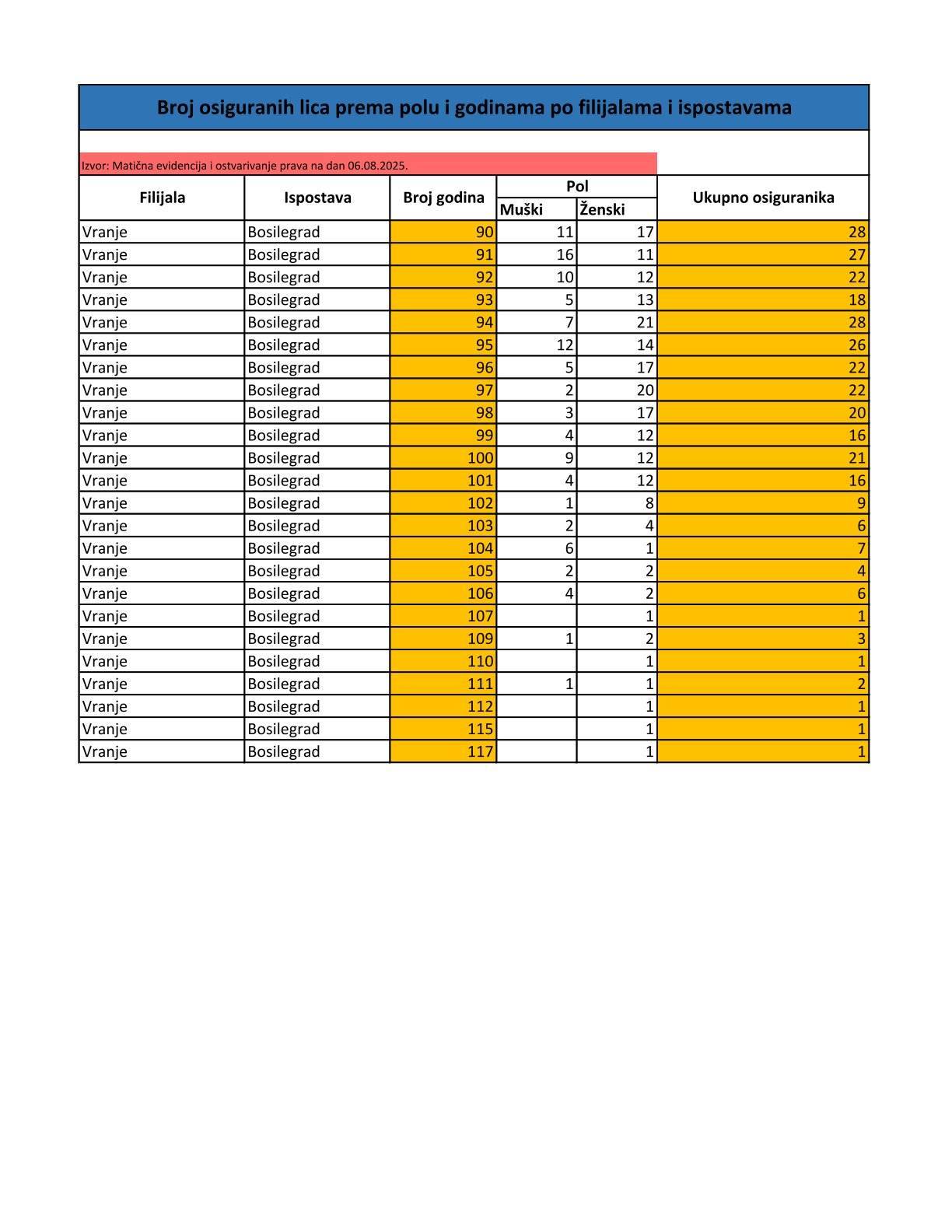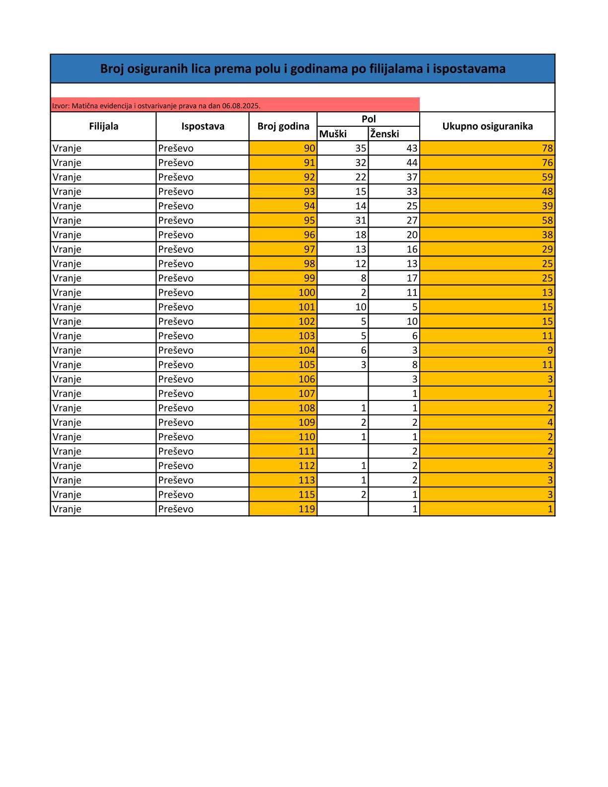 Osuguranika sa 100 i više godine u Preševu ima 98, u Bosilegradu 79, u Surdulici 121, Hanu 143, Trgovištu 78, a u Vranju 466.