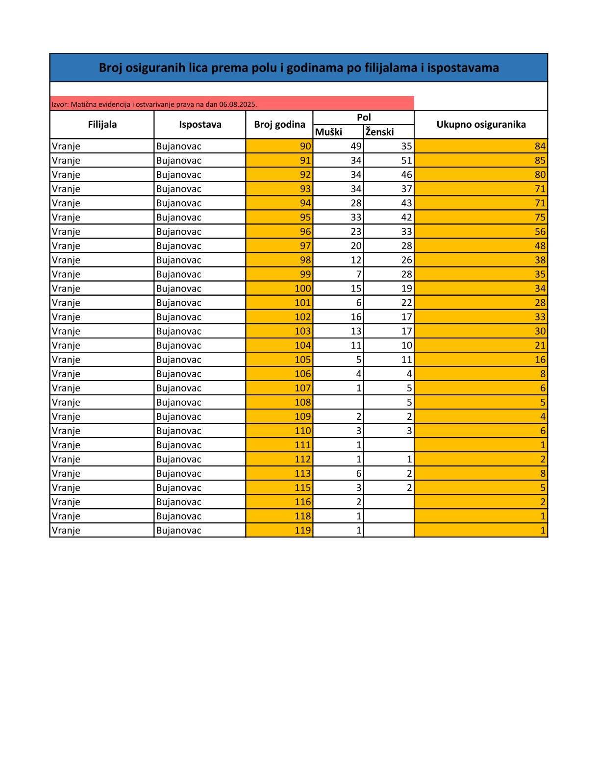 Međutim, Bujanovac je okružni rekorder po broju stogodišnjaka sa 211 osiguranika!