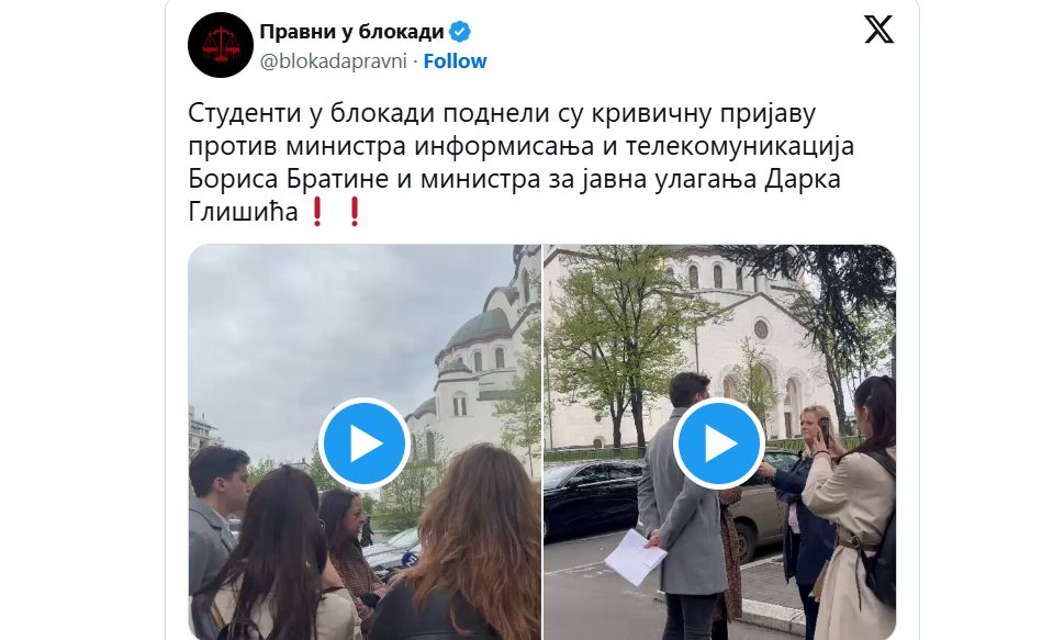 Bujanovac, Beograd, 14. april 2026. – Studenti u blokadi podneli su krivičnu prijavu protiv ministra informisanja i telekomunikacija Borisa Bratine i ministra za javna ulaganja Darka Glišića, prenosi N1.