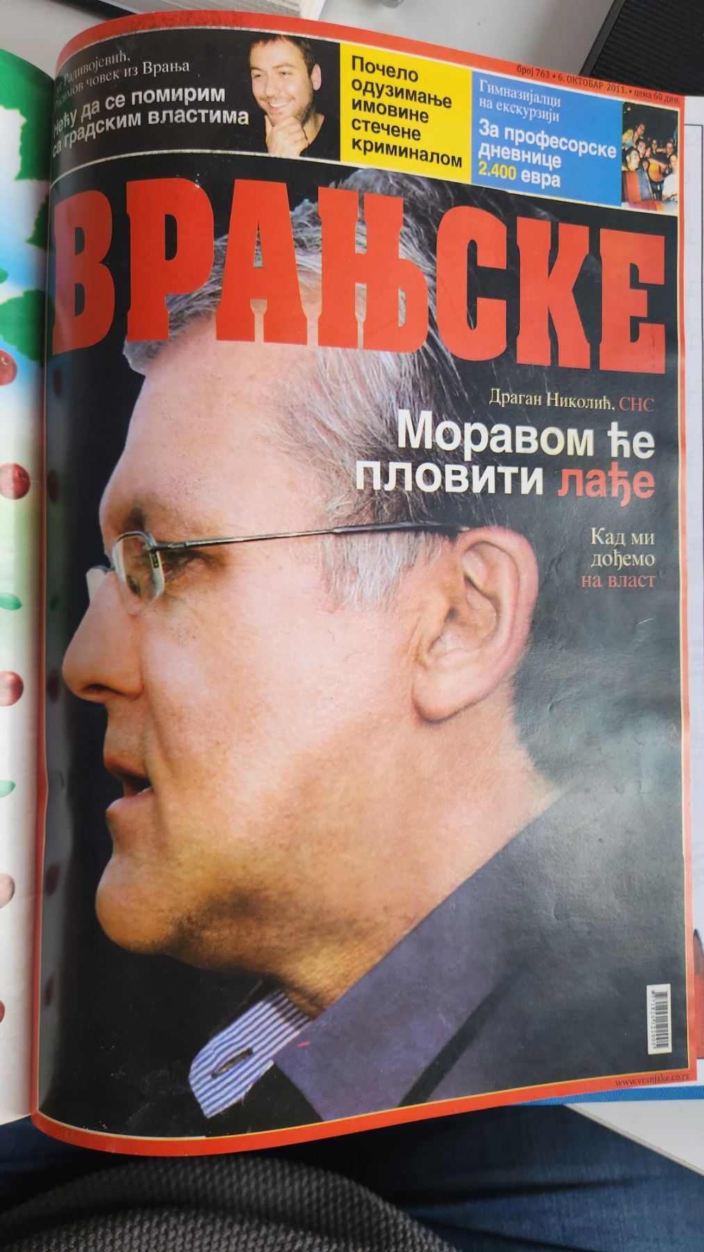 Slika na naslovnoj strani tog broja jeste (foto)montirana, i na njoj se vide on, Nika, budući načelnik Lučke kapetanije Vranje i panrorama tog grada sa morskim plavetnilom koje ga okružuje, i naslov “Dragan Nikolić, SNS: Vranje dobija luku”.
