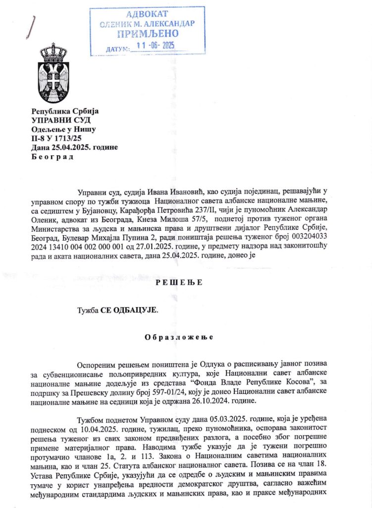 Bujanovac, 17. jun 2025. Upravni sud u Nišu odbacio je tužbu Nacionalnog saveta Albanaca (NSA) protiv Ministarstva za ljudska i manjinska prava koje je poništilo konkurs Saveta za raspodelu subvencija poljoprivrednicima Albancima u Bujanovcu, Preševu i Medveđi. Predsednik NSA Enkel Redžepi ocenio je da je odbacivanje tužbe pokazatelj da nema pravde za Albance.