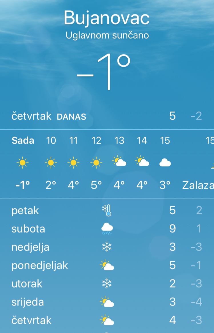 GRADHRONIKANASLOVNAVreme: Hladno, moguće padavine Bujanovac, 13. decembar 2018. Na jugu Srbije ćedanas biti mestimično oblačno i hladno, a mogućesu i padavine. Jutarnja…13. December 2018.