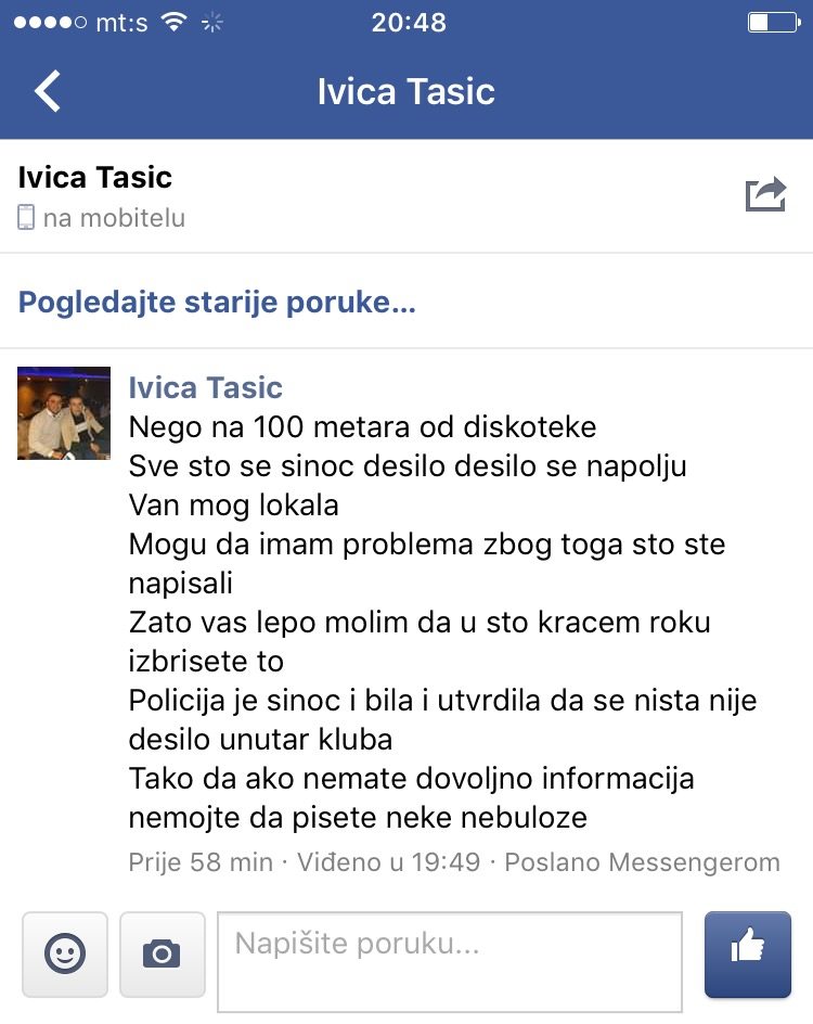 HRONIKANASLOVNAIvica Tasić: D.S. nije povređen u mom lokalu već sto metara dalje Bujanovac, 21. maj 2017.- Ivica Tasić, koji se predstavio kao vlasnik lokala DejaVu, poslao je poruku na FB…21.05.2017.