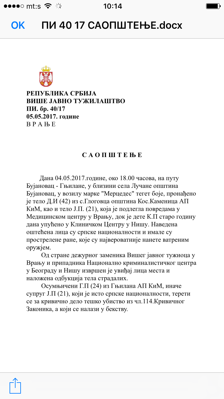 HRONIKANASLOVNAKod Bujanovca ubijene majka i ćerka Bujanovac, 4. Maj 2017.- U dvostrukom ubistvu večeras kod Bujanovca stradale su J.I. (21) i njena majka D.I.…05.05.2017.