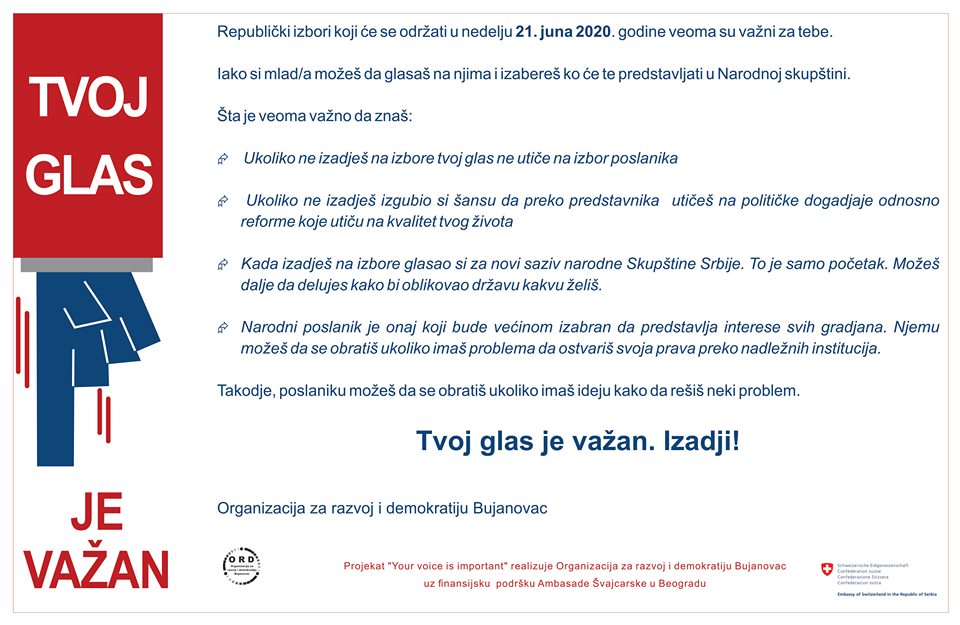 izbori 2020.POLITIKAORD poziva mlade Bujanovčane da glasaju Bujanovac, 18. jun 2020. – Organizacija za razvoj i demokratiju delila je u četvrtak letke kojima poziva mlade…18. June 2020.