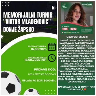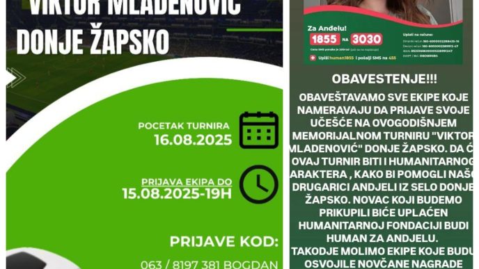 DRUŠTVONASLOVNASPORTSPORTMali fudbal za veliki cilj – pomoć Anđeli iz Žapskog Bujanovac, 10. avgust 2025. – Tradicionalni memorijalni turnir u malom fudbalu u selu Žapsko, koji počinje 16. avgusta,…10. August 2025.