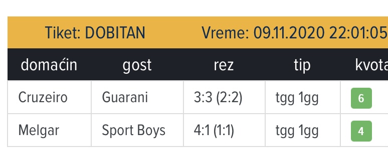 NASLOVNASPORTMajstor iz Trnovca, na dve utakmice zaradio 2.000 evra Bujanovac, 11. novembar 2020.- Brazilska Serija B, plus čileanska seansa za južnjački dobitak zasnovan na jakom ulogu, ovako…11. November 2020.