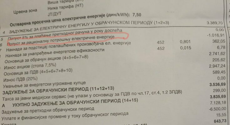 Ministria e Minierave dhe Energjisë njoftoi se zbritja e miratuar për konsumin racional të energjisë elektrike është 637,48 milionë dinarë.