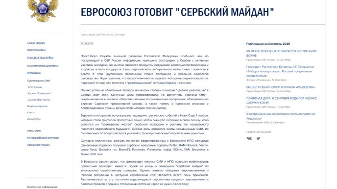DRUŠTVONASLOVNARuska obaveštajna služba označila grupu nezavisnih medija da spremaju “srpski Majdan” Bujanovac, 16. septembar 2025. – Služba za odnose sa medijima Spoljno obaveštajne službe Ruske Federacije saopštila je da…16. September 2025.