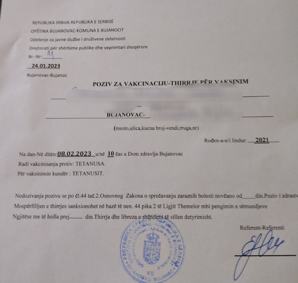 DRUŠTVONASLOVNAPonovo se dele pozivi za vakcinaciju u Bujanovcu Bujanovac, 2. februar 2023. Bujanovčani čija deca nisu vakcinisana proteklih nekoliko dana dobijaju pozive za imunizaciju, koji se…2. February 2023.