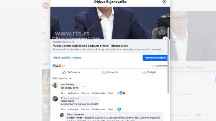 DRUŠTVONASLOVNAPOLITIKAČitaoci o Vučićevoj najavi žestokog odgovora: Od pošto jajca do Živeo Predsednik! Piše: N. Stevanović Bujanovac, 18. avgust 2025. Od „Pošto su jajca predsedniče“ do „Zaboravio si stanove za mlade“…18. August 2025.