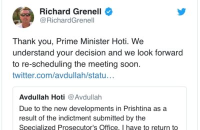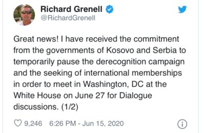 KOSOVONASLOVNAPOLITIKATviter diplomatija: Odložen sastanak u Vašingtonu Bujanovac, 26. jun 2020. (Foto Tviter) – Američki izaslanik za dijalog Ričard Grenel rekao je da će uskoro…26. June 2020.