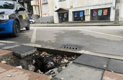 GRADNASLOVNARupa u novom trotoaru na glavnoj ulici opasnost za pešake Bujanovac, 8. jun 2021.- Na novom trotoaru kod Tržnog centra “Balkan” prema Muzičkoj školi u Bujanovcu posle radova…8. June 2021.
