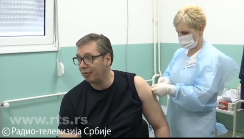 DRUŠTVOKORONANASLOVNAVučić se revakcinisao u Pukovcu Bujanovac, Pukovac, 27. april 2021. (Foto snimak ekrana RTS)-Predsednik Aleksandar Vučić je u Pukovcu kod Doljevca primio drugu…27. April 2021.